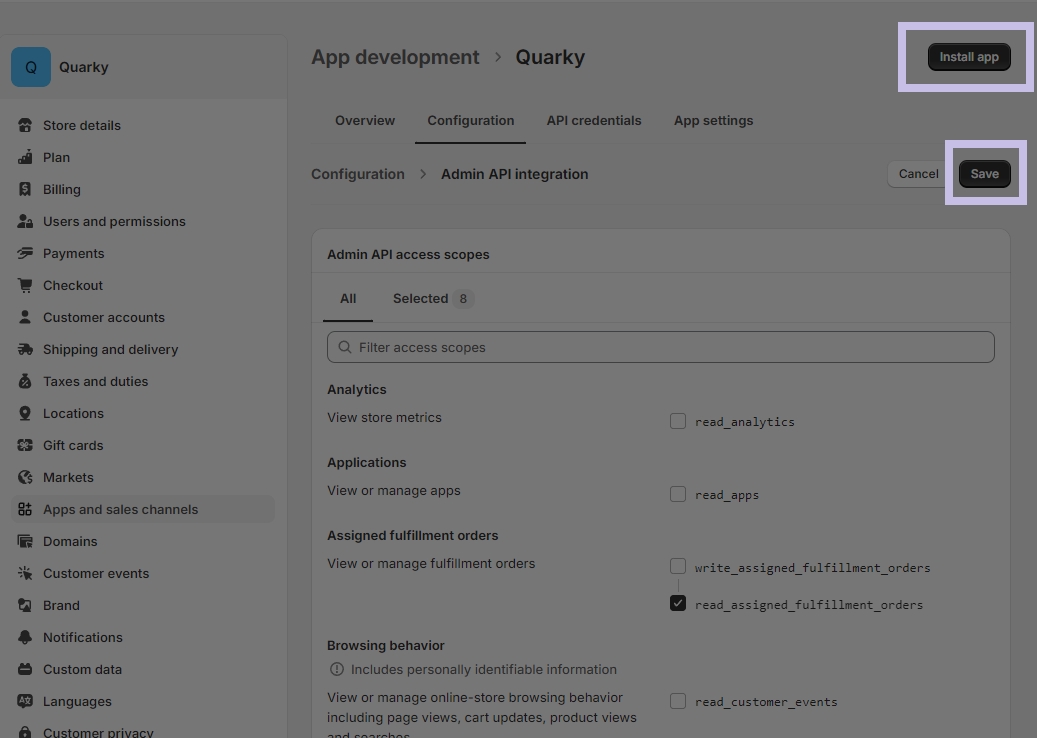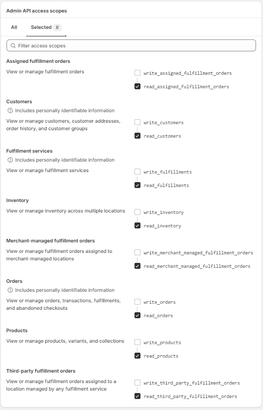 Admin API access scopessearch for the following and enable them all as shown in the images below