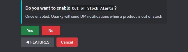 Once enabled, Quarky will send DM notifications when a product is low or out of stock in a specific location