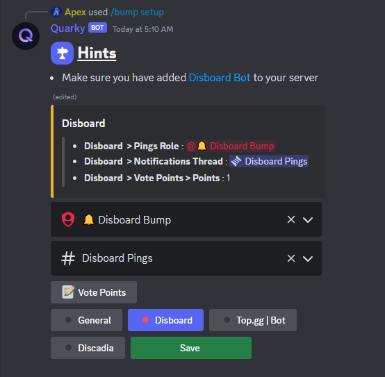 Pings Role: Select a role to be pinged when members should bump the server on Disboard.Notifications Thread: Choose a public thread for receiving notifications related to Disboard bumps. [Note: You can create a thread namedDisboard Pingsin the voters channel and use it]Vote Points: Define the number of points awarded per Disboard bump.