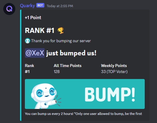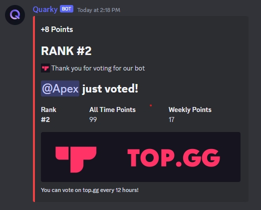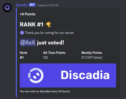 When someone votes, a message will be sent to the voters' channel containing the voter's rank, name, total points, and weekly points. These details offer insights into the voter's contribution to the server's growth on platforms like Disboard, Discadia, and Top.gg.