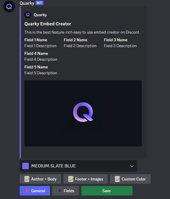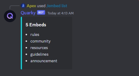 In this guide, we explore the functionality of Quarky's embed creator. Through three distinct commands, this feature equips users with the tools to create detailed and engaging embeds.