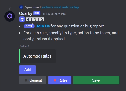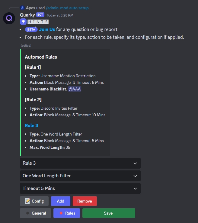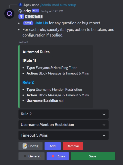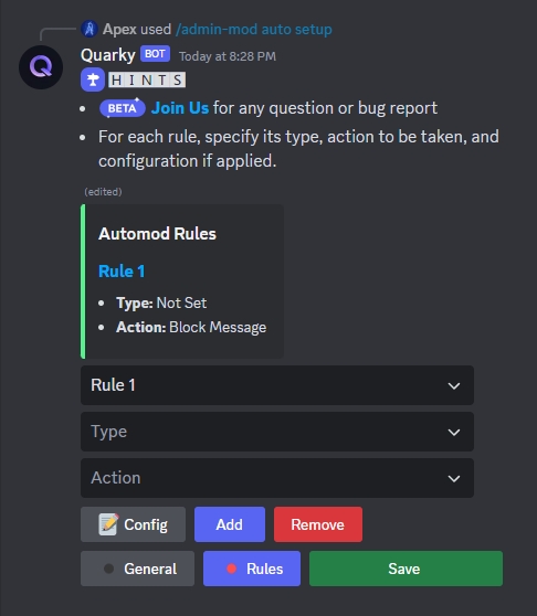 Rulesbutton. Here, you can define rules for the QMod AutoMod, specifying theirtype,actionto be taken when triggered, andconfigurationif applicable.