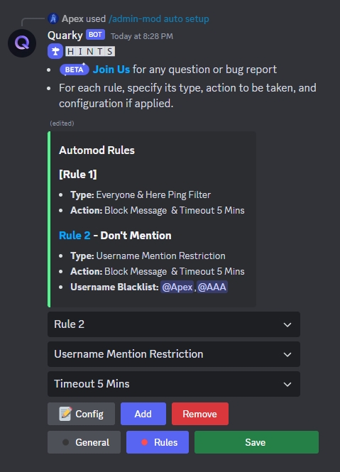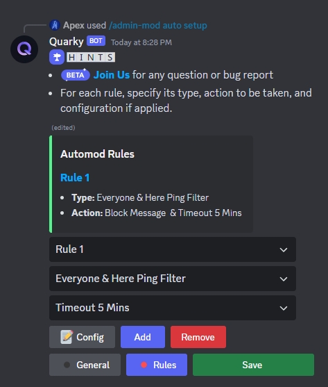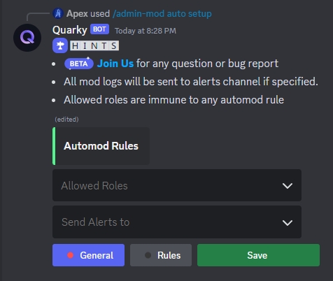 /admin-mod auto setupcommand. Here, you can select allowed roles that are immune to AutoMod rules and specify the channel where AutoMod alerts will be sent.