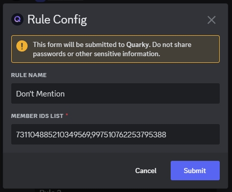 Configbutton, this will open a modal where you can inputUser IDsand optionally specify aRule Name.