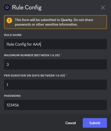 Configbutton to fill in other missing values likemaximum allowed numberandduration resetYou can optionally specify the name for the rule andpasswordfor enhanced security. Once you are done clickSubmit