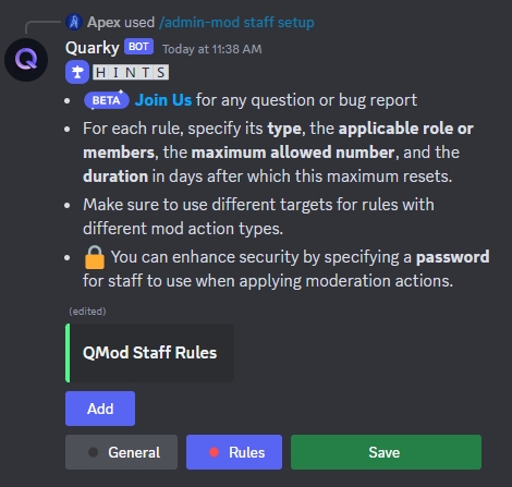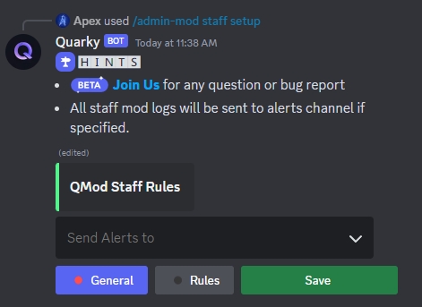 /admin-mod staff setupcommand. Here, you can specify the channel where mod actions will be sent.