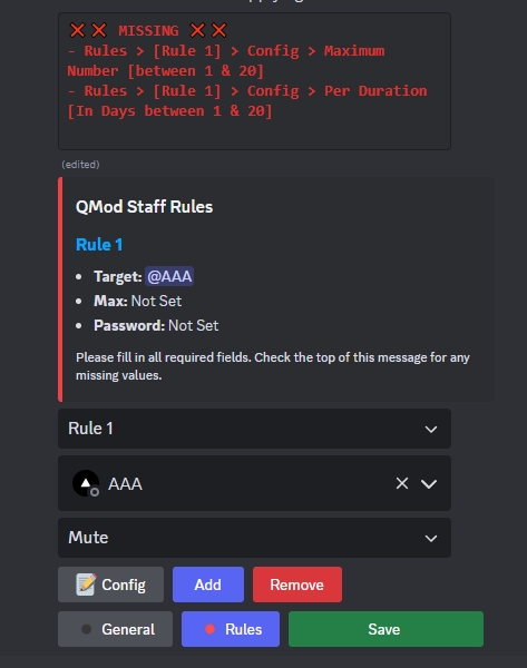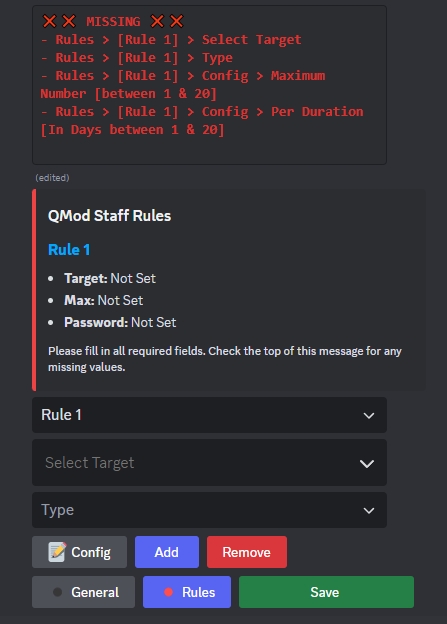 Addbutton: As you can see the embed color turnsRed(meaning there are missing required values) and Quarky will show you all those missing values.