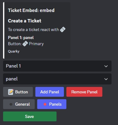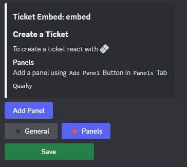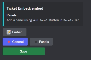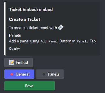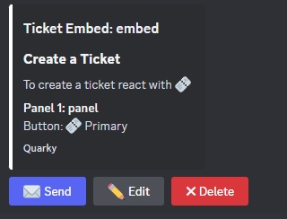 Saveon the ticket embed. You can now send it to any channel you want usingSendbutton, edit it again usingEditbutton or delete it usingDeletebutton.