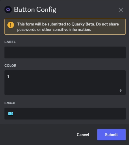 Button Label: Text shown on the buttonButton Color:0for Grey,1for Blurple,2for Green and3for Red.Button Emoji: Emoji shown on the button then clickSubmit