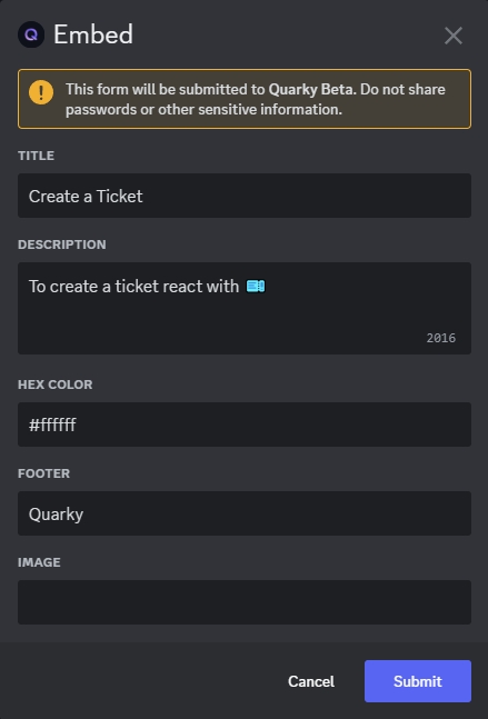 Embedbutton and give the embedTitle,Description,Hex Color,FooterandImagethen clickSubmit. Note that all these options are optional but its better to set them for a clear embed style