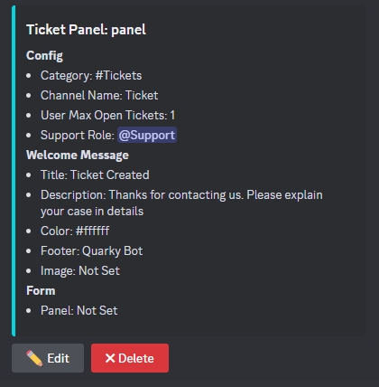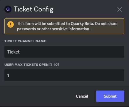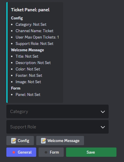 Ticket Channel Name: Name of the channel created when users click on the create ticket button.User Max Tickets Open: Maximum number of allowed tickets for a single user in this panel.then click
