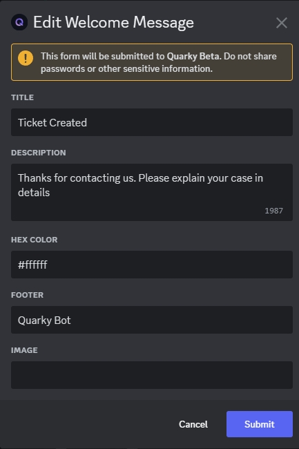 Welcome Messagebutton to configure welcome message embed when a user creates a ticket